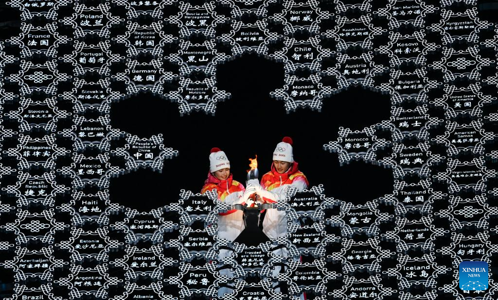 Torch bearers Dinigeer Yilamujiang (L) and Zhao Jiawen set the torch into the Olympic cauldron during the opening ceremony of the Beijing 2022 Olympic Winter Games at the National Stadium in Beijing, capital of China, Feb. 4, 2022. (Xinhua/Li Ga)