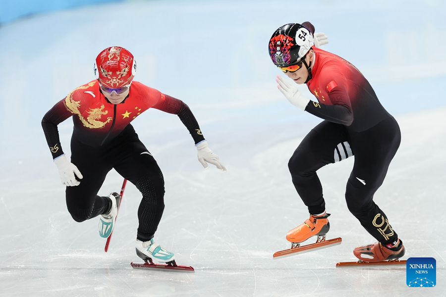 Ren Ziwei (R) and Li Wenlong of China celebrate after the men's 1,000m final of short track speed skating at Capital Indoor Stadium in Beijing, capital of China, Feb. 7, 2022. Ren Ziwei and Li Wenlong claimed the gold and the silver medal respectively in the event. (Xinhua/Lan Hongguang)