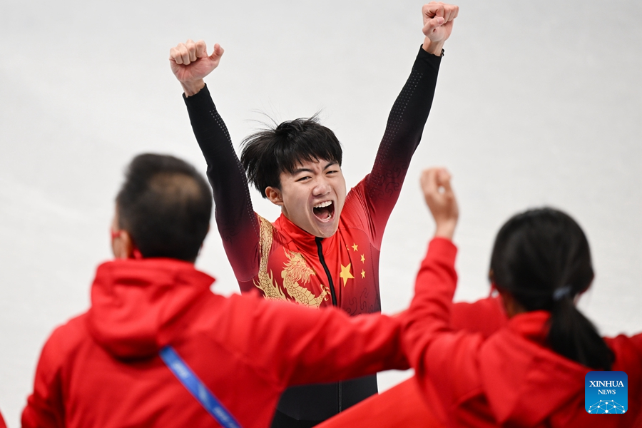 Li Wenlong (C) of China celebrates after winning the silver medal in the men's 1,000m final of short track speed skating at Capital Indoor Stadium in Beijing, capital of China, Feb. 7, 2022. (Xinhua/Li Ga)
