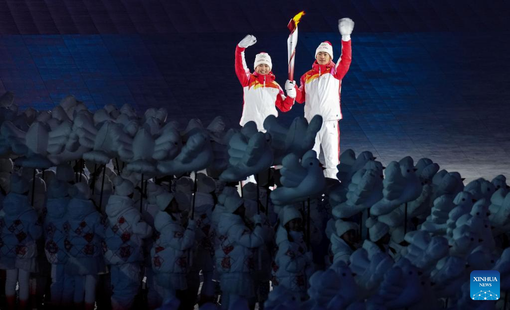 Torch bearers Dinigeer Yilamujiang and Zhao Jiawen holding the last torch gesture during the opening ceremony of the Beijing 2022 Olympic Winter Games at the National Stadium in Beijing, capital of China, Feb. 4, 2022. (Xinhua/Li An)