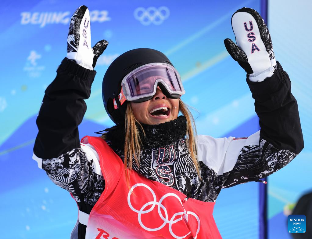 Chloe Kim of the United States reacts during the women's snowboard halfpipe final at Genting Snow Park in Zhangjiakou, north China's Hebei Province, Feb. 10, 2022. (Xinhua/Xu Chang)