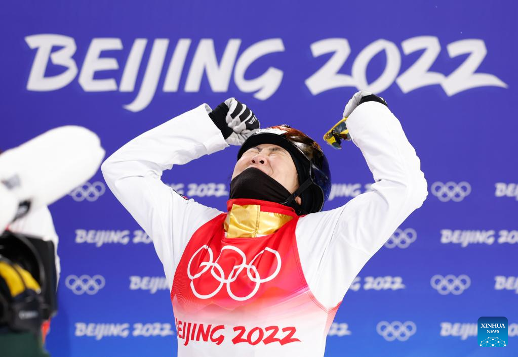 Xu Mengtao of China reacts after the freestyle skiing mixed team aerials final at Genting Snow Park in Zhangjiakou, north China's Hebei Province, Feb. 10, 2022. (Xinhua/Xue Yubin)