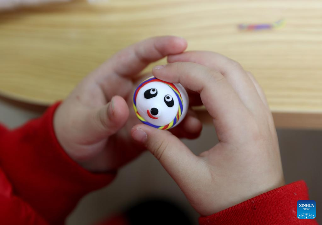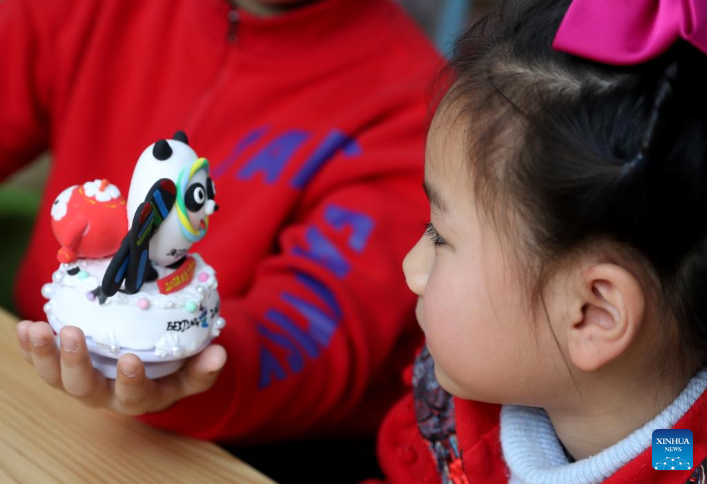 A child looks at a music box decorated with Bing Dwen Dwen, the mascot for the Beijing 2022 Olympic Winter Games, and Shuey Rhon Rhon, the mascot of Beijing 2022 Paralympic Winter Games, made of colored clay at Xidu sub-district of Fengxian District in east China's Shanghai, Feb. 10, 2022. (Xinhua/Liu Ying)