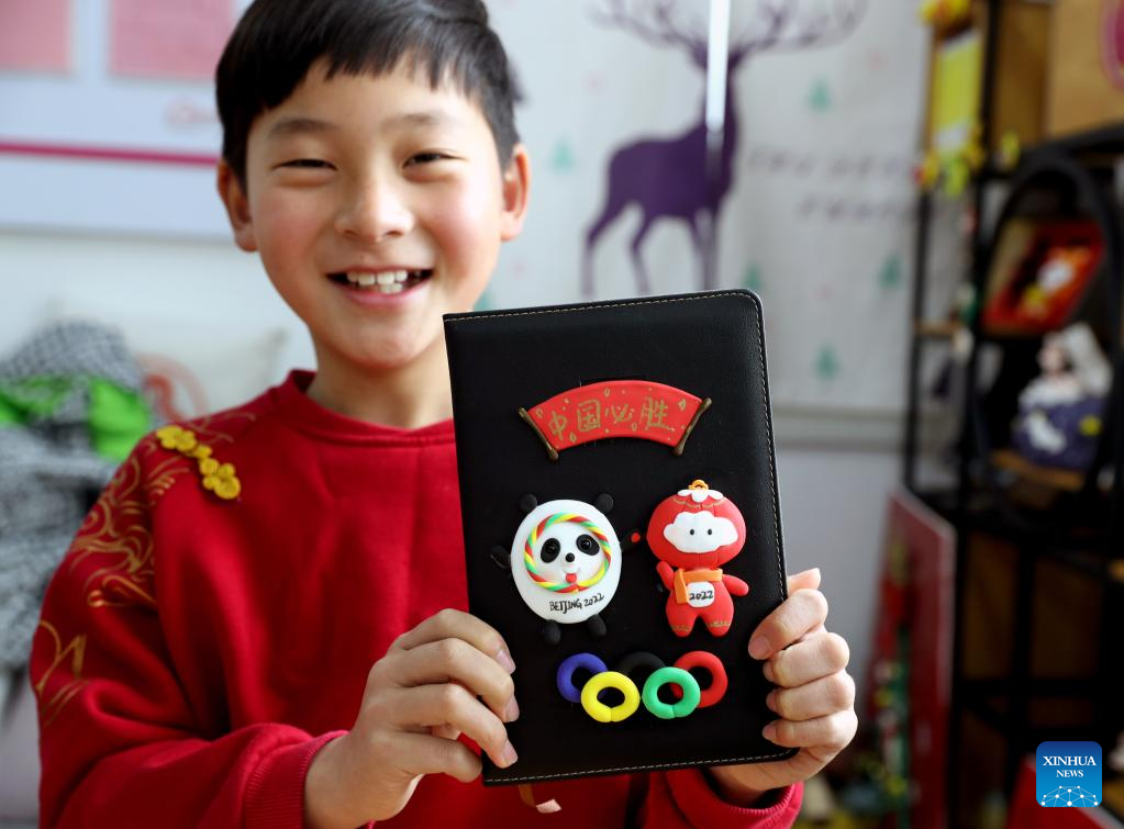 Chen Hongyu shows his self-made Bing Dwen Dwen, the mascot for the Beijing 2022 Olympic Winter Games, and Shuey Rhon Rhon, the mascot of Beijing 2022 Paralympic Winter Games, with colored clay at Xidu sub-district of Fengxian District in east China's Shanghai, Feb. 10, 2022. (Xinhua/Liu Ying)