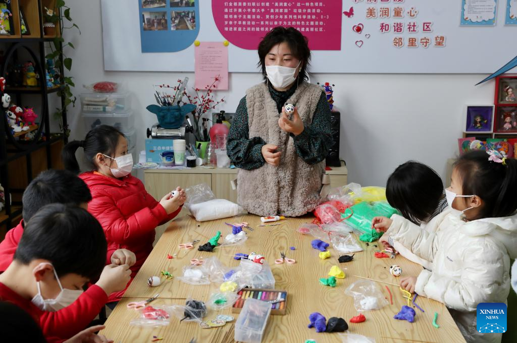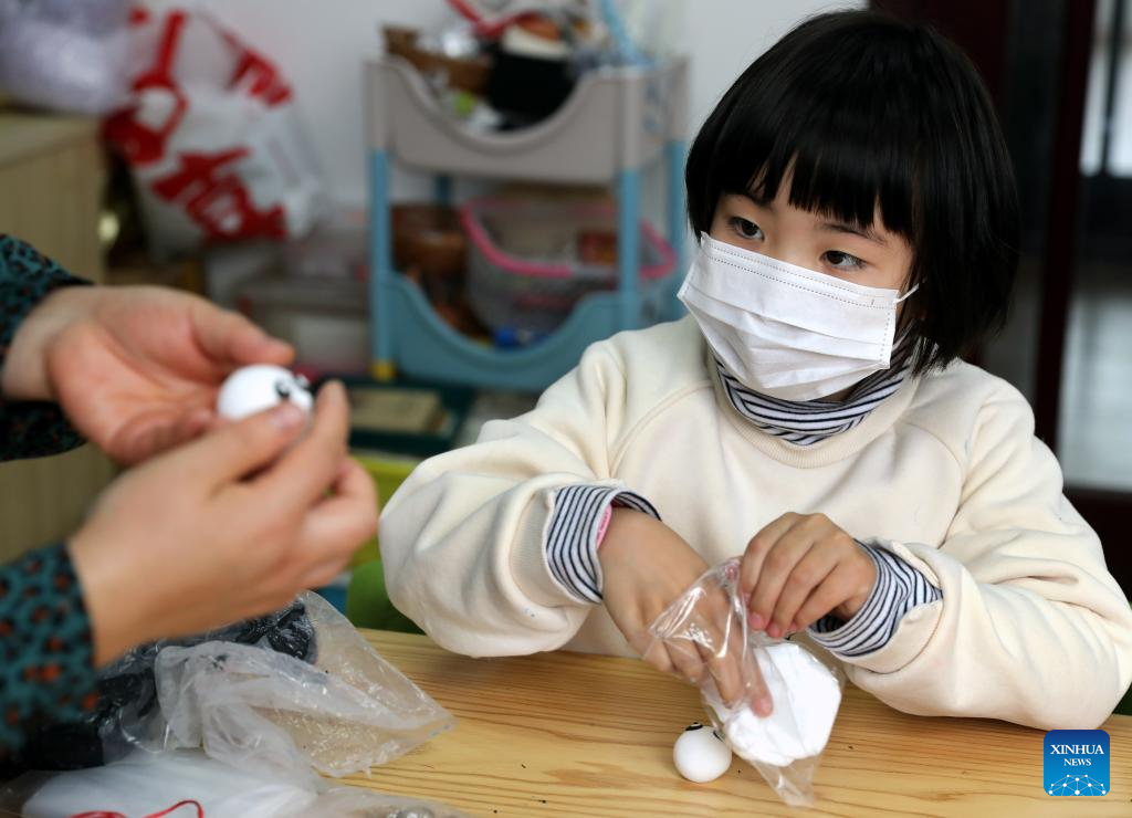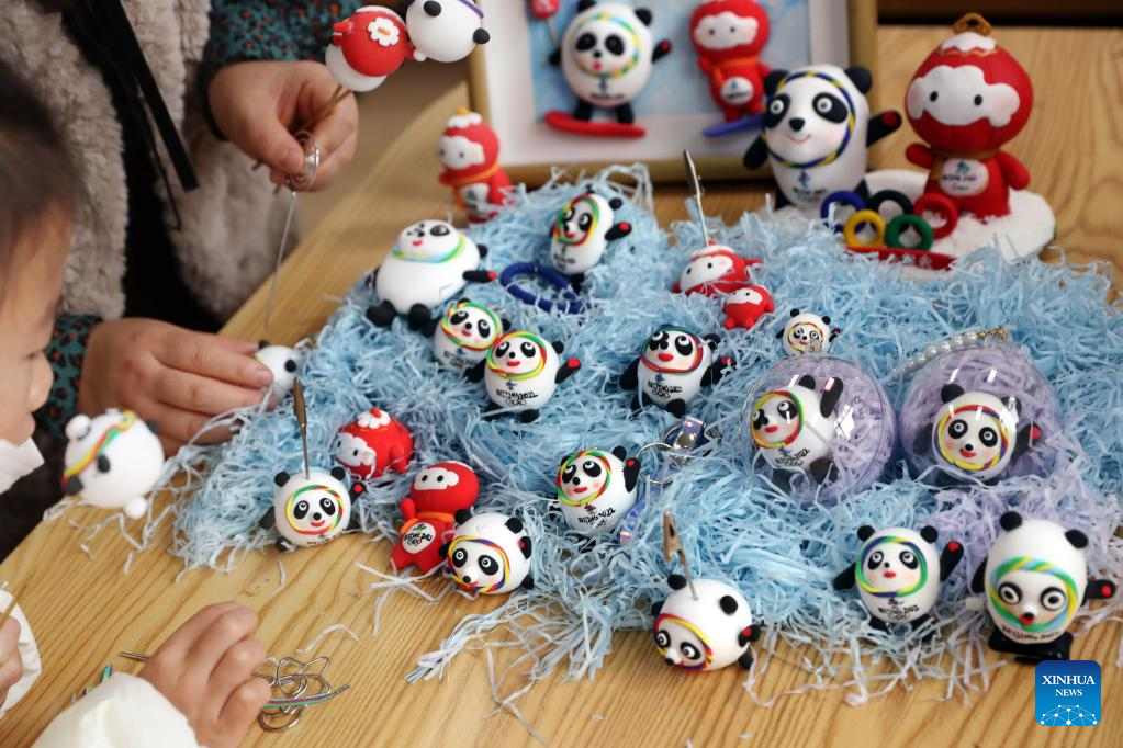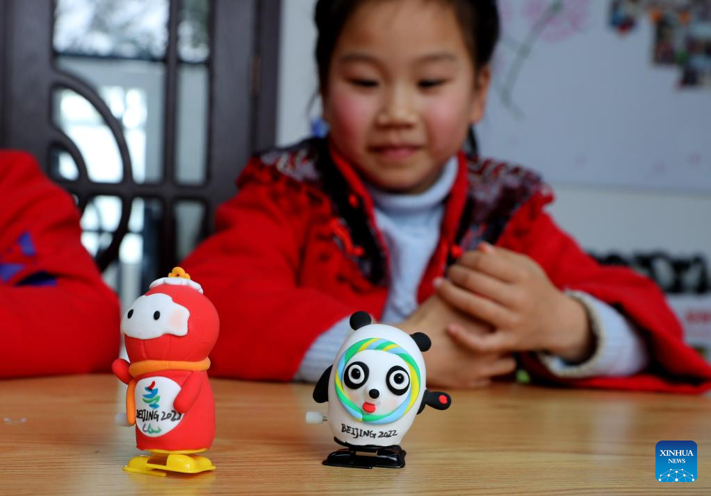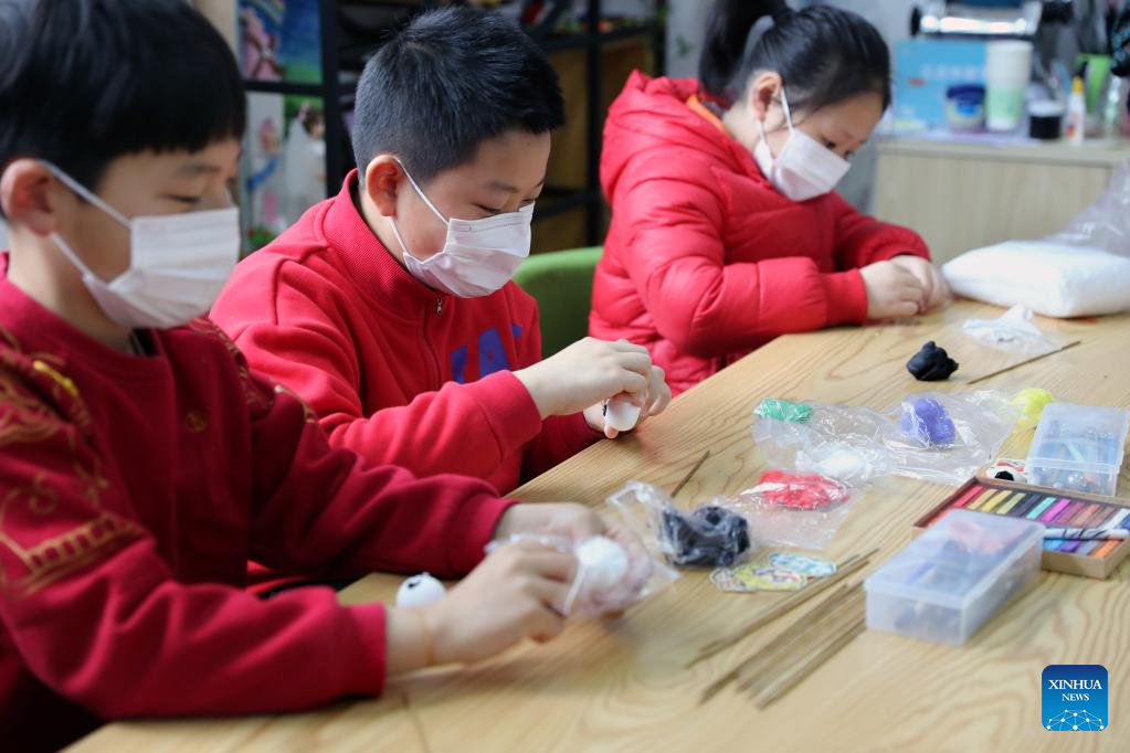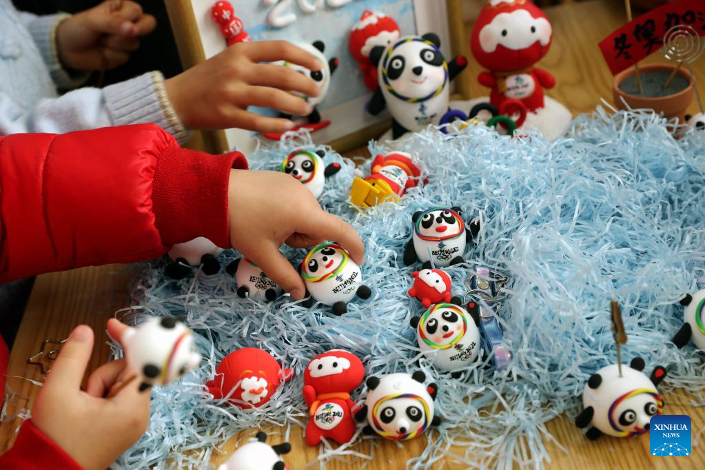 Children make Bing Dwen Dwen, the mascot for the Beijing 2022 Olympic Winter Games, and Shuey Rhon Rhon, the mascot of Beijing 2022 Paralympic Winter Games, with colored clay at Xidu sub-district of Fengxian District in east China's Shanghai, Feb. 10, 2022. (Xinhua/Liu Ying)