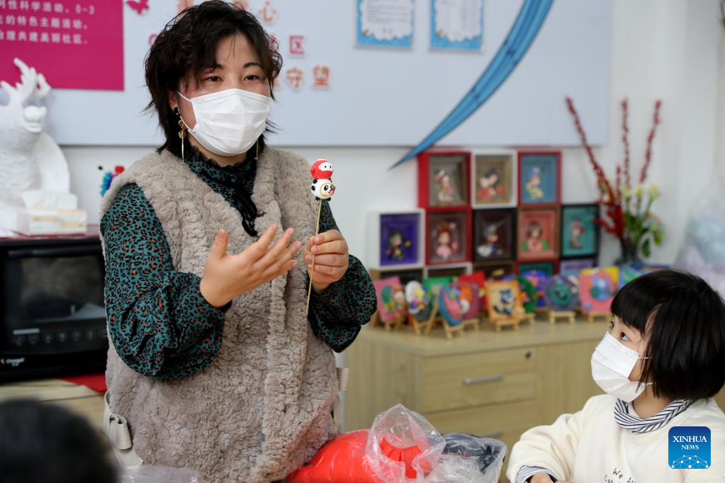 Shang Yue'e, a community volunteer, teaches children to make Bing Dwen Dwen, the mascot for the Beijing 2022 Olympic Winter Games, and Shuey Rhon Rhon, the mascot of Beijing 2022 Paralympic Winter Games, with colored clay at Xidu sub-district of Fengxian District in east China's Shanghai, Feb. 10, 2022. (Xinhua/Liu Ying)