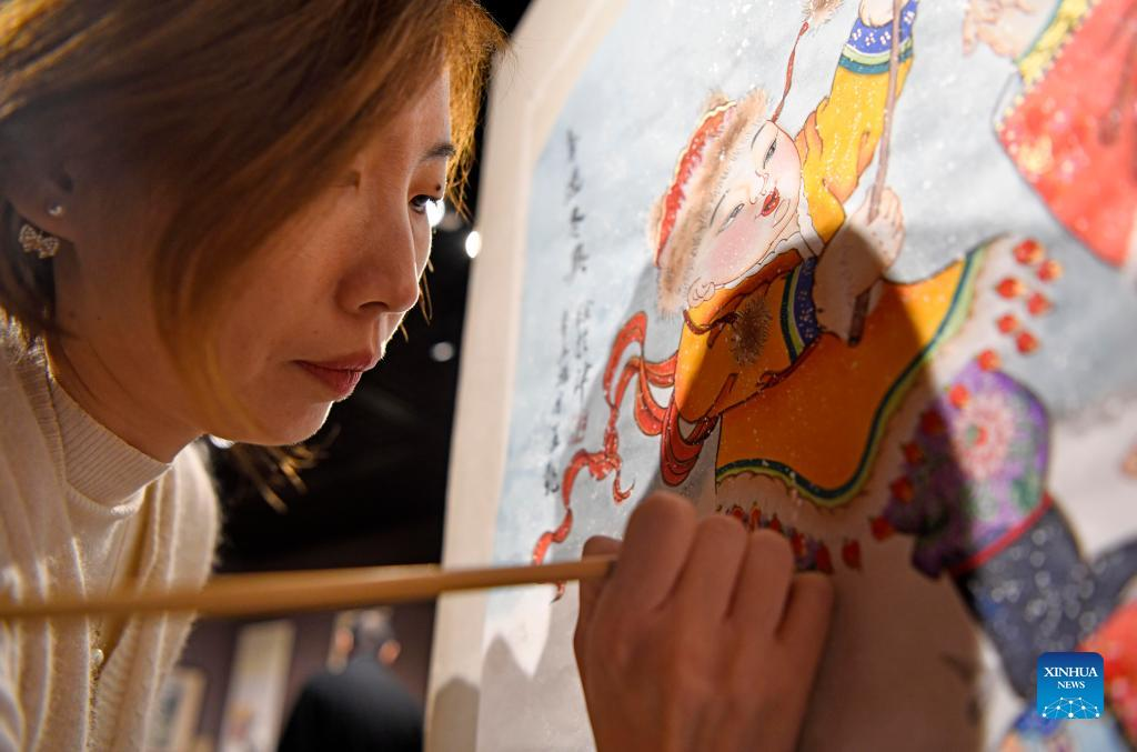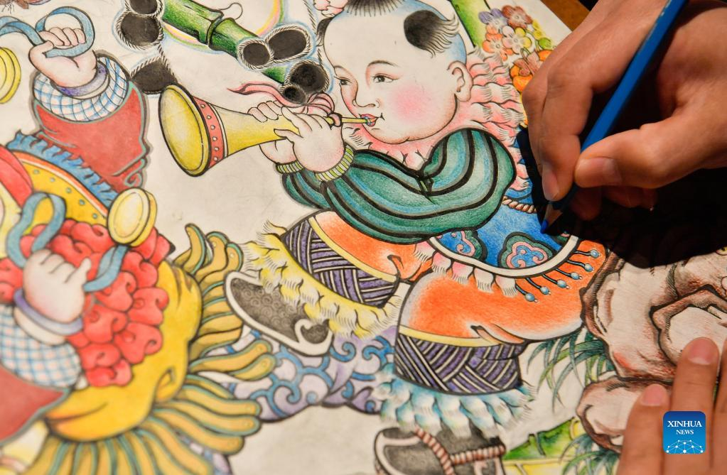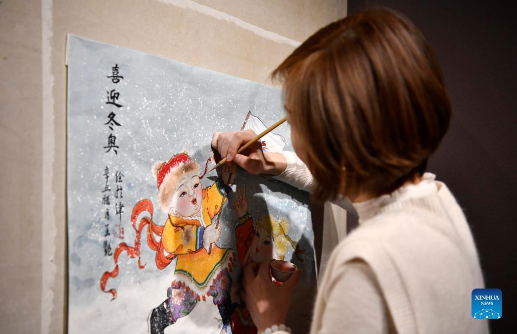 A member of a Yangliuqing woodblock painting team works on a piece of work in Tianjin, north China, Feb. 10, 2022. A team committed to inheriting the Yangliuqing woodblock painting in Tianjin recently created New Year drawings involving various elements of Olympic Winter Games, hoping to promote the sportsmanship and Olympic spirit. The Yangliuqing woodblock painting was one of the most popular forms of New Year decorations in China, which flourished in Tianjin and the surrounding areas during a period between the late Ming Dynasty (1368-1644) and the early Qing Dynasty (1644-1911). (Xinhua/Sun Fanyue)