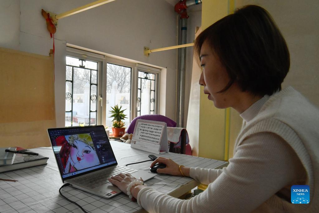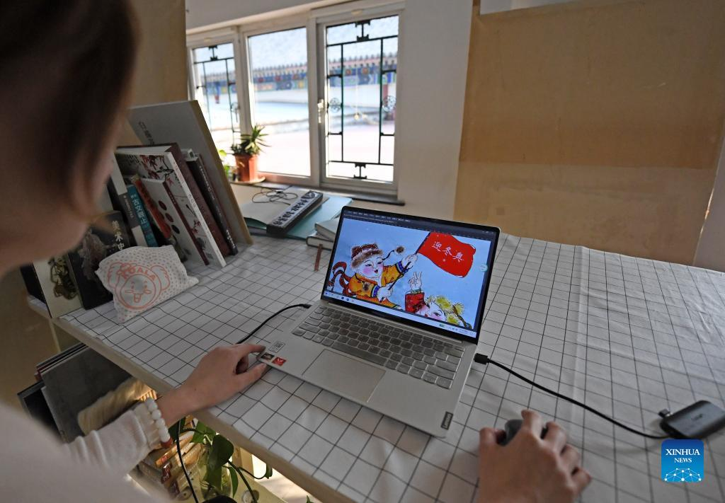Wang Yan, a member of the Yangliuqing woodblock painting team, works a piece of work on a laptop in Tianjin, north China, Feb. 10, 2022. A team committed to inheriting the Yangliuqing woodblock painting in Tianjin recently created New Year drawings involving various elements of Olympic Winter Games, hoping to promote the sportsmanship and Olympic spirit. The Yangliuqing woodblock painting was one of the most popular forms of New Year decorations in China, which flourished in Tianjin and the surrounding areas during a period between the late Ming Dynasty (1368-1644) and the early Qing Dynasty (1644-1911). (Xinhua/Sun Fanyue)