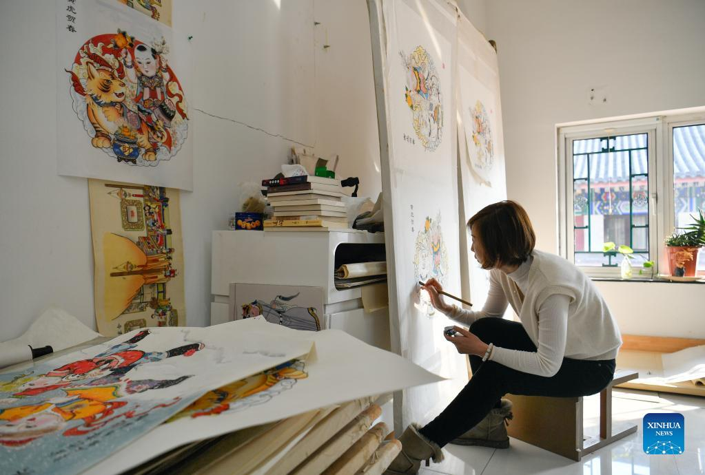 Wang Yan, a member of a Yangliuqing woodblock painting team, works on a piece of work in Tianjin, north China, Feb. 10, 2022. A team committed to inheriting the Yangliuqing woodblock painting in Tianjin recently created New Year drawings involving various elements of Olympic Winter Games, hoping to promote the sportsmanship and Olympic spirit. The Yangliuqing woodblock painting was one of the most popular forms of New Year decorations in China, which flourished in Tianjin and the surrounding areas during a period between the late Ming Dynasty (1368-1644) and the early Qing Dynasty (1644-1911). (Xinhua/Sun Fanyue)