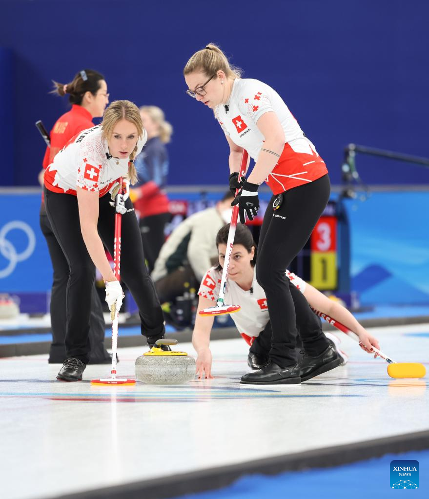 Alina Paetz (R) of Switzerland competes during the Curling Women's Round Robin Session 2 of the Beijing 2022 Winter Olympics between China and Switzerland at the National Aquatics Centre in Beijing, capital of China, Feb. 10, 2022. (Xinhua/Lan Hongguang)
