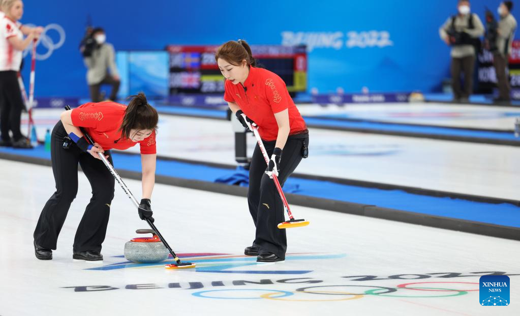 Dong Ziqi (L) of China and her teammate Zhang Lijun of China compete during the Curling Women's Round Robin Session 2 of the Beijing 2022 Winter Olympics between China and Switzerland at the National Aquatics Centre in Beijing, capital of China, Feb. 10, 2022. (Xinhua/Lan Hongguang)