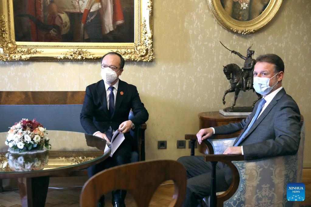 Croatian Parliament Speaker Gordan Jandrokovic (L) meets with Chinese Ambassador to Croatia Qi Qianjin in Zagreb, Croatia, on Feb. 9, 2022. (Patrik Macek/PIXSELL via Xinhua)