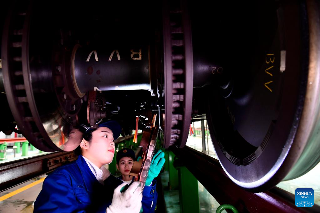 Yang Jingxian, a bullet train mechanist, checks a train at Jinan bullet train service station in Jinan, east China's Shandong Province, Feb. 10, 2022. There is a maintenance team composed of five post-98s women at Jinan bullet train service station. Not long after starting their work in October last year, these young mechanists witnessed their first Spring Festival travel rush.