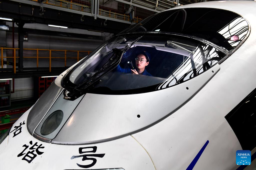 Xiao Yunxiao, a bullet train mechanist, checks a train at Jinan bullet train service station in Jinan, east China's Shandong Province, Feb. 10, 2022. There is a maintenance team composed of five post-98s women at Jinan bullet train service station. Not long after starting their work in October last year, these young mechanists witnessed their first Spring Festival travel rush.