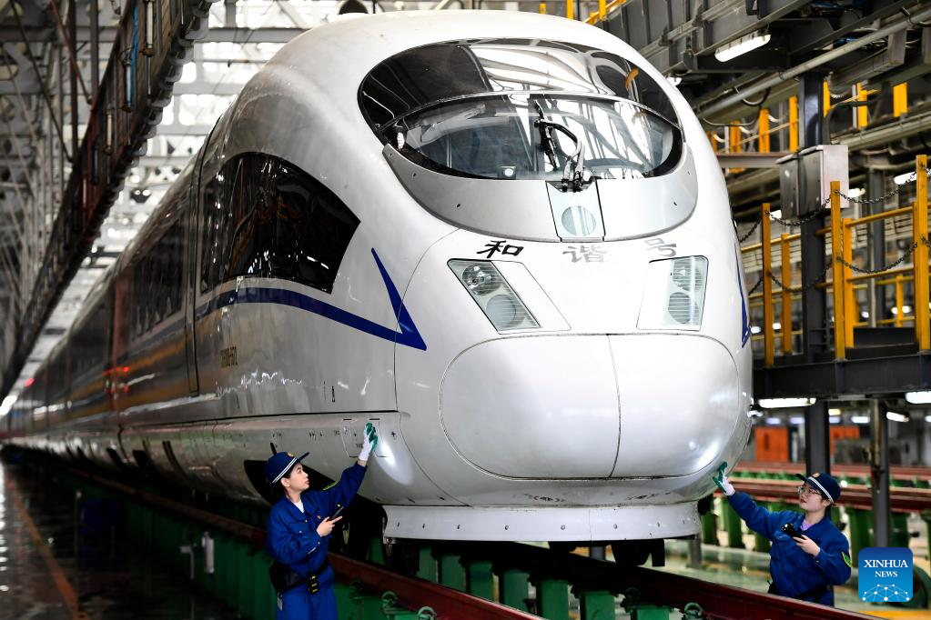 Faced with a workload of 23 bullet trains to be checked every day during the travel rush, the team members spared no efforts to maintain the trains for safe operation. (Xinhua/Guo Xulei)