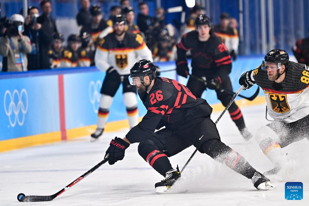 David Desharnais (2nd R) and Adam Cracknell (2nd L) of Canada compete during ice hockey men's Group A match between Canada and Germany at Wukesong Sports Centre in Beijing, capital of China, Feb. 10, 2022. (Xinhua/Song Yanhua)