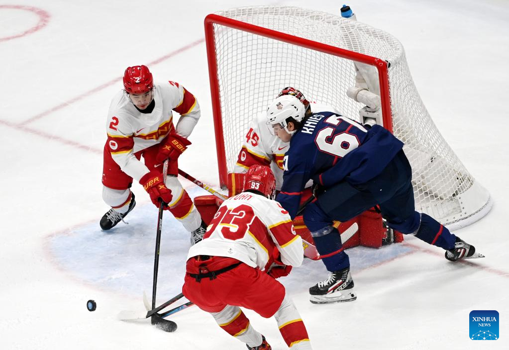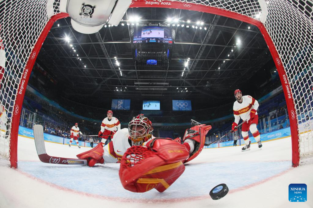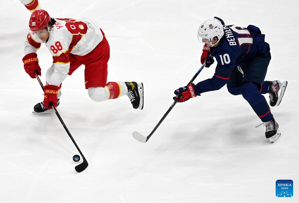 Athletes compete during ice hockey men's Group A match between the United States and China at National Indoor Stadium in Beijing, capital of China, Feb. 10, 2022. (Xinhua/Li Ziheng)