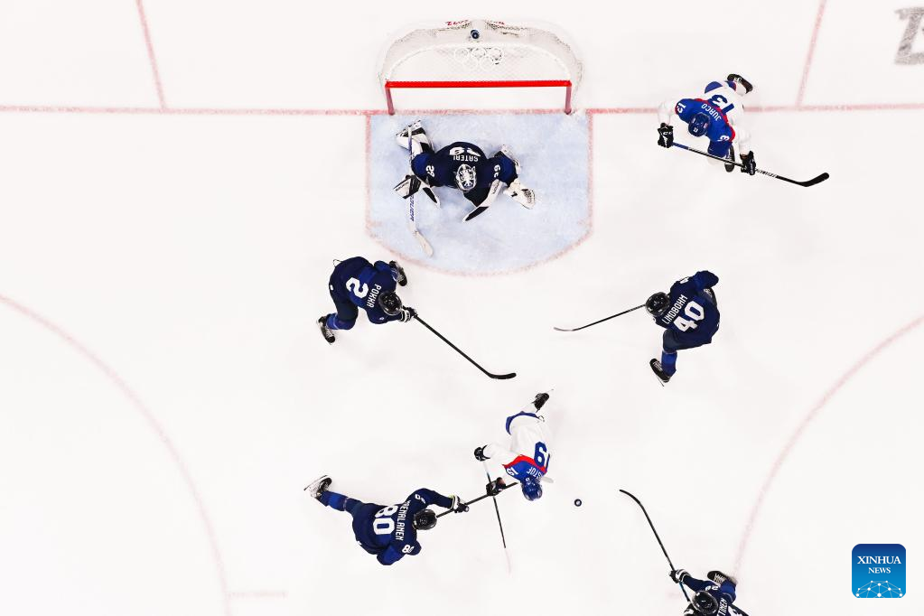 Branislav Konrad (top) of Slovakia competes during the ice hockey men's Group C match between Finland and Slovakia at National Indoor Stadium in Beijing, capital of China, Feb. 10, 2022. (Xinhua/Xue Yuge)