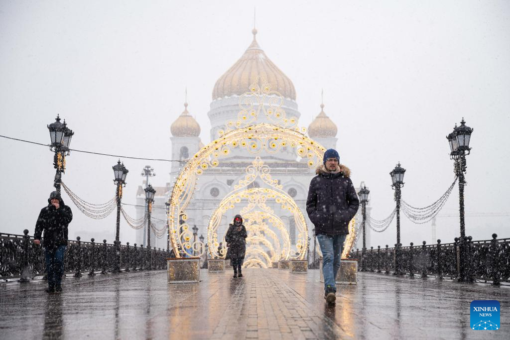 People walk on a bridge near the Cathedral of Christ the Saviour in Moscow, Russia, Feb. 10, 2022. (Xinhua/Bai Xueqi)