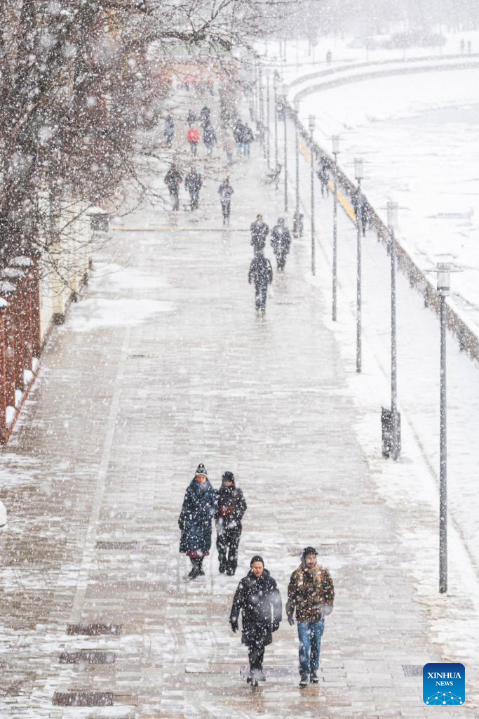 People walk along a river in Moscow, Russia, Feb. 10, 2022. (Xinhua/Bai Xueqi)