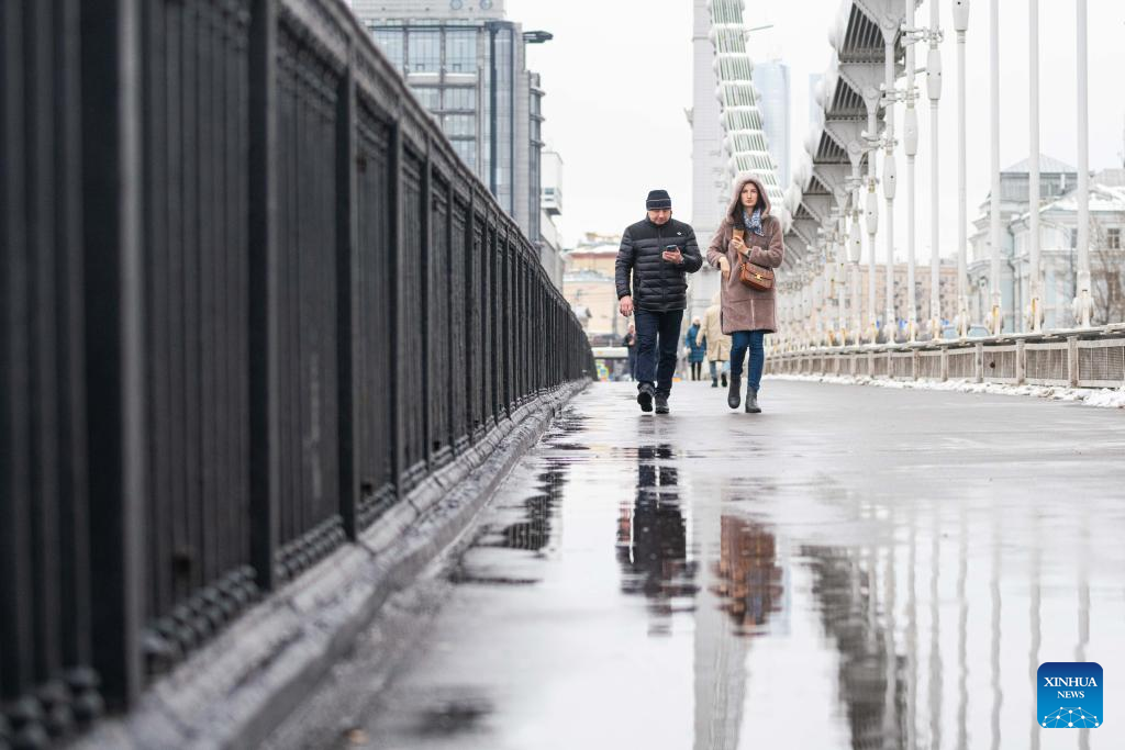 People walk on a bridge in Moscow, Russia, Feb. 10, 2022. (Xinhua/Bai Xueqi)