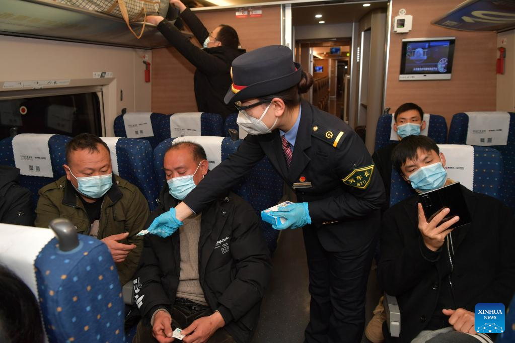 A crew member distributes alcohol pads to passengers on the train G2733 bound from Nanchang of east China's Jiangxi Province to Shenzhen of south China's Guangdong Province, Feb. 10, 2022. As railway stations entered the travel rush of returning passengers, Nanchang section of China Railway Nanchang Group Co., Ltd. has strengthened its efforts to reduce the risk of COVID-19 infections and ensure the safety of passengers. (Xinhua/Peng Zhaozhi)