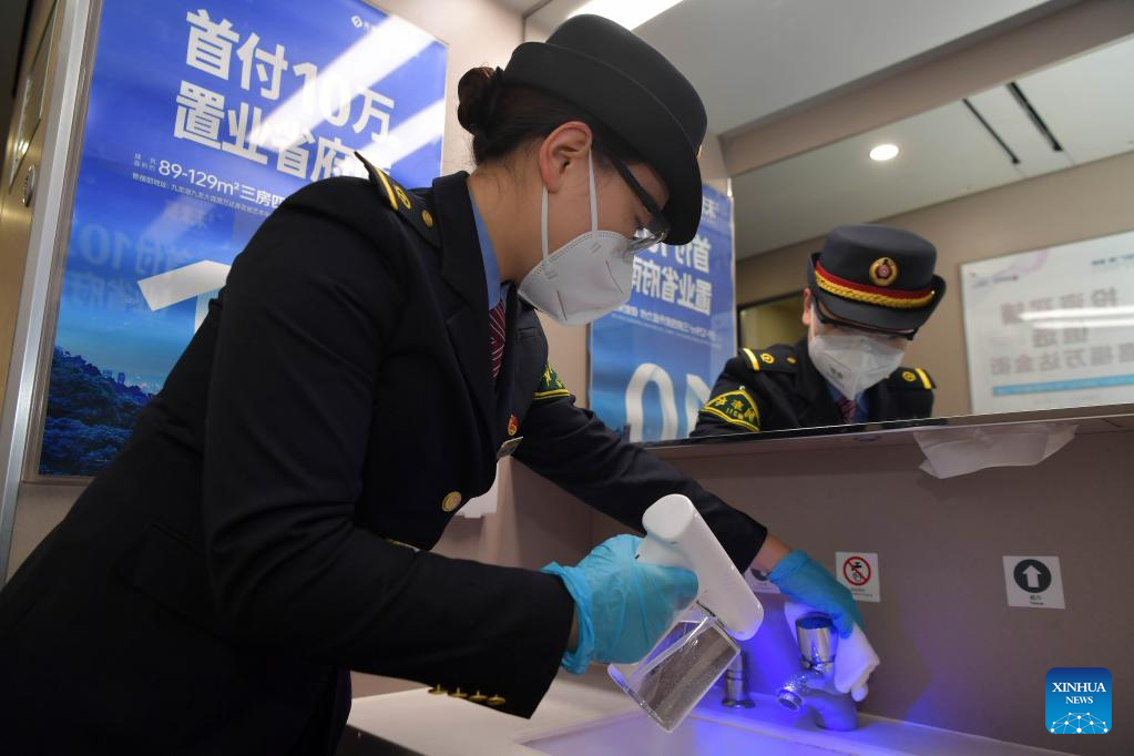 A crew member disinfects the area of hand washing on the train G2733 bound from Nanchang of east China's Jiangxi Province to Shenzhen of south China's Guangdong Province, Feb. 10, 2022. As railway stations entered the travel rush of returning passengers, Nanchang section of China Railway Nanchang Group Co., Ltd. has strengthened its efforts to reduce the risk of COVID-19 infections and ensure the safety of passengers. (Xinhua/Peng Zhaozhi)