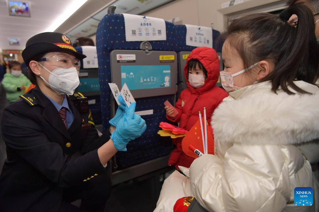 A crew member presents souvenirs to children on the train G488 bound from Nanchang of east China's Jiangxi Province to capital Beijing, Feb. 10, 2022. As railway stations entered the travel rush of returning passengers, Nanchang section of China Railway Nanchang Group Co., Ltd. has strengthened its efforts to reduce the risk of COVID-19 infections and ensure the safety of passengers. (Xinhua/Peng Zhaozhi)