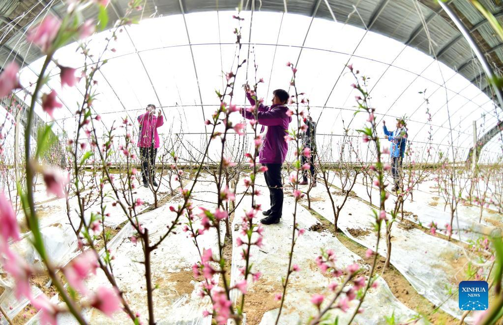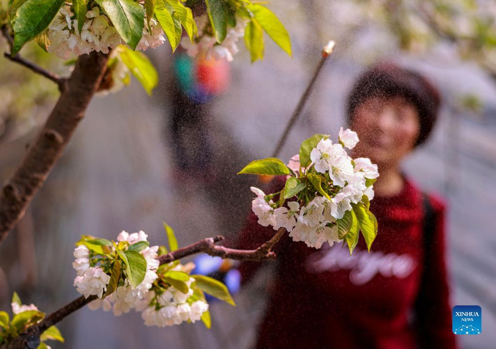 A farmer pollinates cherry blossoms in Yinjia Village of Shangzhuang Town, Rongcheng, east China's Shandong Province, Feb. 11, 2022. (Photo by Li Xinjun/Xinhua)