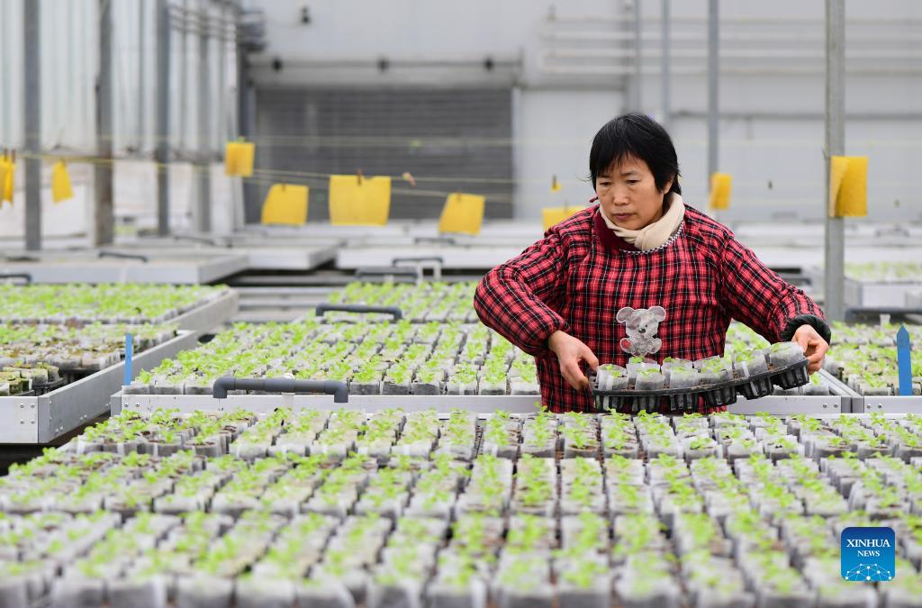 A worker arranges vegetable seedlings at an agricultural technology enterprise in Huagang Town of Hefei city, east China's Anhui Province, Feb. 11, 2022. (Photo by Xu Yong/Xinhua)