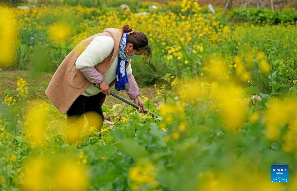 Farmers work in a field in Luoping County of Qujing City, southwest China's Yunnan province, Feb. 11, 2022. (Photo by Mao Hong/Xinhua)