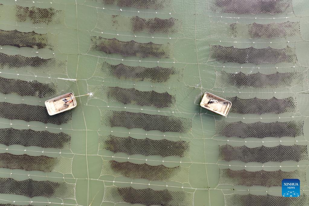 Aerial photo taken on Feb. 10, 2022 shows coastal farmers managing laver in Ganyu District of Lianyungang City, east China's Jiangsu Province. (Photo by Si Wei/Xinhua)