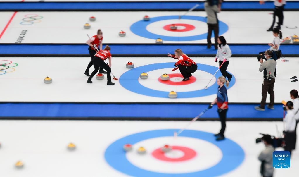 Athletes of Canada (2nd bottom) compete during the Curling Women's Round Robin Session 3 of the Beijing 2022 Winter Olympics between Canada and Japan at the National Aquatics Centre in Beijing, capital of China, Feb. 11, 2022. (Xinhua/Liu Xu)