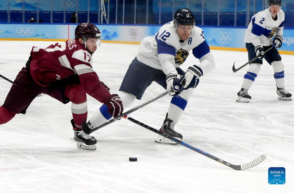 Sami Vatanen (2nd R) of Finland competes during the ice hockey men's preliminary round Group C match between Latvia and Finland at National Indoor Stadium in Beijing, capital of China, Feb. 11, 2022. (Xinhua/Li Ziheng)