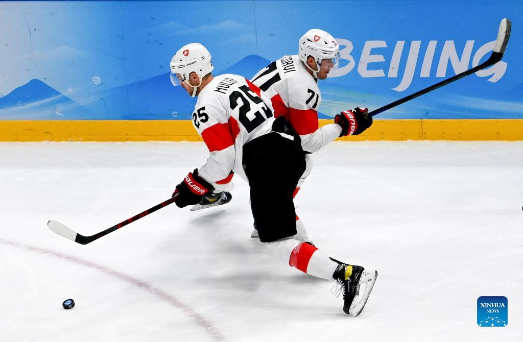 Ramon Untersander (1st R) of Switzerland competes during the ice hockey men's preliminary round Group B match between the Czech Republic and Switzerland at National Indoor Stadium in Beijing, capital of China, Feb. 11, 2022. (Xinhua/Liu Xiao)
