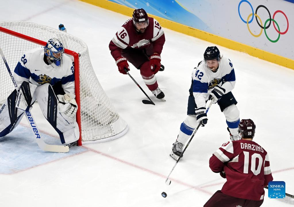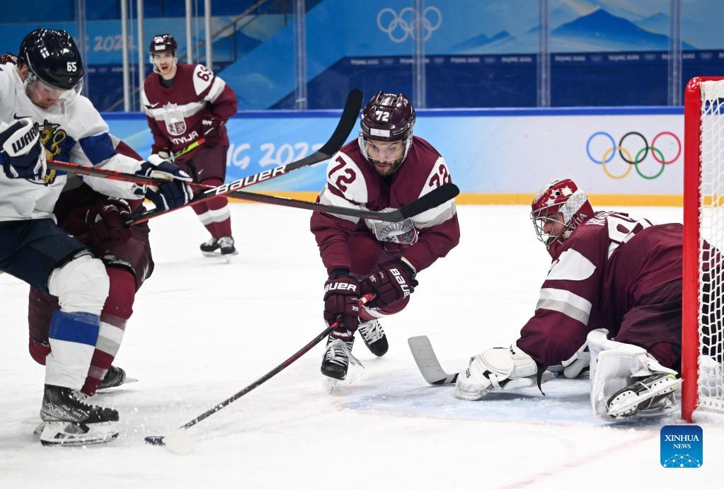 (220212) -- BEIJING, Feb. 11, 2022 (Xinhua) -- Janis Jaks (2nd R) of Latvia competes during the ice hockey men's preliminary round Group C match between Latvia and Finland at National Indoor Stadium in Beijing, capital of China, Feb. 11, 2022. (Xinhua/Li An)