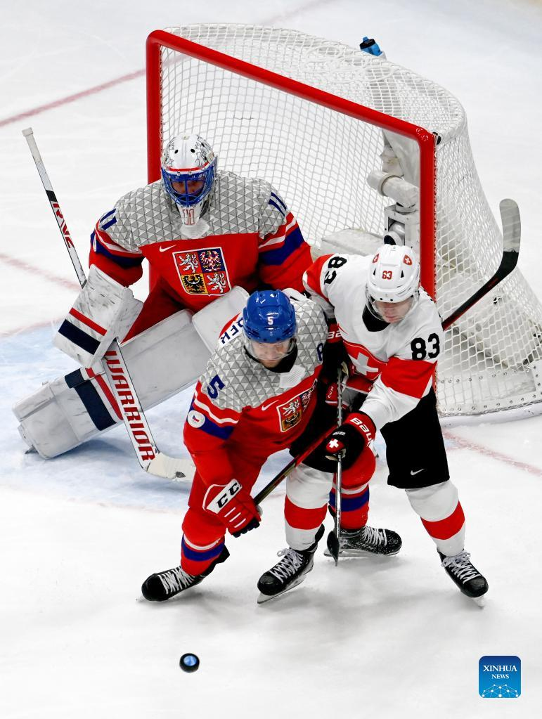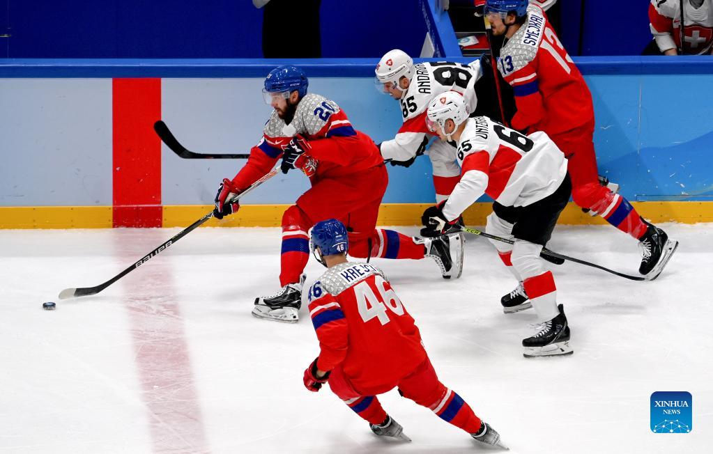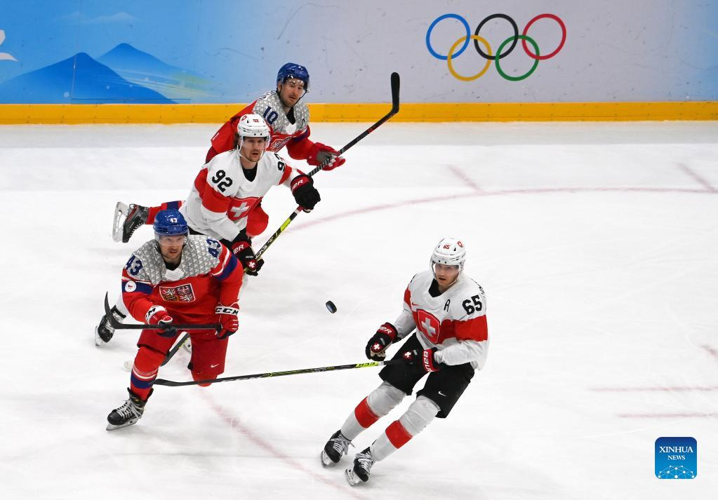 Athletes compete during the ice hockey men's preliminary round Group B match between the Czech Republic and Switzerland at National Indoor Stadium in Beijing, capital of China, Feb. 11, 2022. (Xinhua/Liu Xiao)
