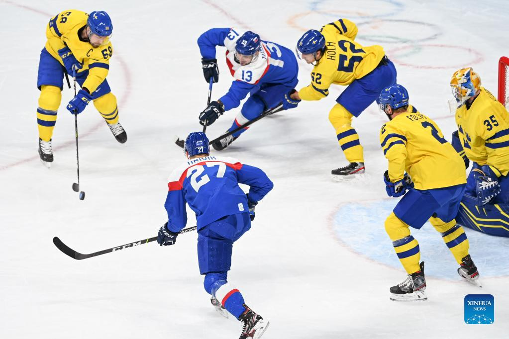 Lukas Bengtsson (C) of Sweden vies for the puck during the ice hockey men's preliminary round Group C match between Sweden and Slovakia at Wukesong Sports Centre in Beijing, capital of China, Feb. 11, 2022. (Xinhua/Song Yanhua)
