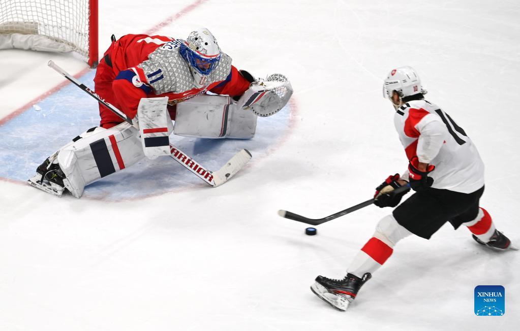 David Krejci (L) of the Czech Republic scores his penalty during the ice hockey men's preliminary round Group B match between the Czech Republic and Switzerland at National Indoor Stadium in Beijing, capital of China, Feb. 11, 2022. (Xinhua/Liu Xiao)