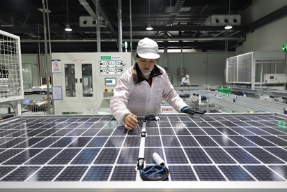 A worker makes new-type solar panels at a plant of a new energy technology company in Sihong county, east China’s Jiangsu province, Dec. 28, 2021. (Photo by Geng Huaijun/People’s Daily Online)