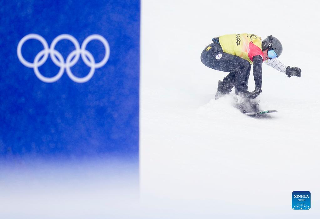 Kristina Paul of ROC competes during the mixed team snowboard cross quaterfinals at Genting Snow Park in Zhangjiakou, north China's Hebei Province, Feb. 12, 2022. (Xinhua/Xu Chang)