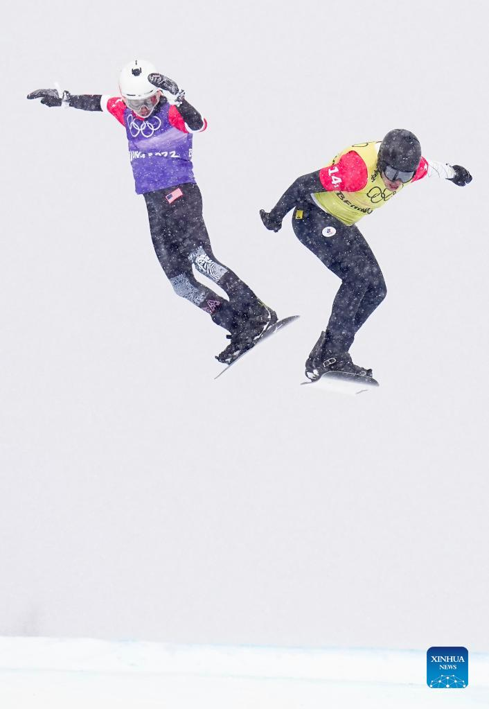 Daniil Donskikh (R) of ROC and Jake Vedder of the United States compete during the mixed team snowboard cross quaterfinals at Genting Snow Park in Zhangjiakou, north China's Hebei Province, Feb. 12, 2022. (Xinhua/Xu Chang)
