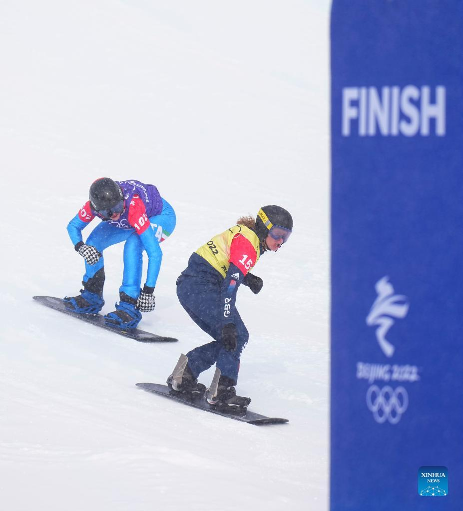 Charlotte Bankes (front) of Great Britain and Caterina Carpano of Italy compete during the mixed team snowboard cross quaterfinals at Genting Snow Park in Zhangjiakou, north China's Hebei Province, Feb. 12, 2022. (Xinhua/Xu Chang)