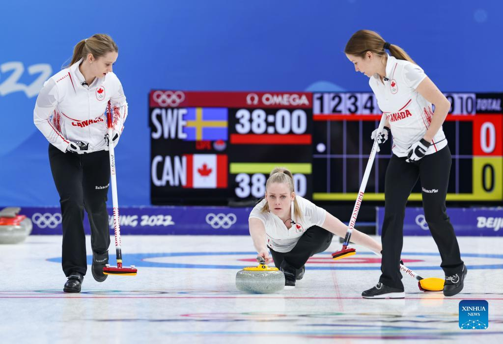 Canada's Kaitlyn Lawes, Dawn McEwen and Jocelyn Peterman (from R to L) compete during curling women's robin session 4 of Beijing 2022 Winter Olympics between Sweden and Canada at National Aquatics Centre in Beijing, capital of China, Feb. 12, 2022. (Xinhua/Wang Jingqiang)