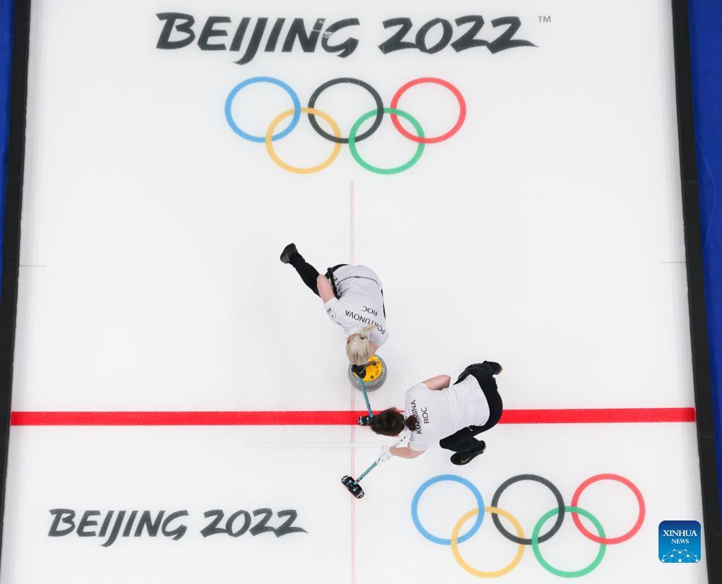 Julia Portunova (top) and Ekaterina Kuzmina of ROC compete during curling women's robin session 4 of Beijing 2022 Winter Olympics between Republic of Korea and ROC at National Aquatics Centre in Beijing, capital of China, Feb. 12, 2022. (Xinhua/Wang Jingqiang)