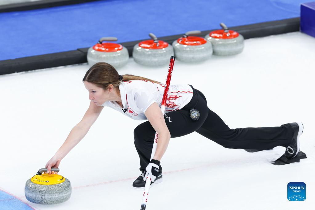 Canada's Kaitlyn Lawes competes during curling women's robin session 4 of Beijing 2022 Winter Olympics between Sweden and Canada at National Aquatics Centre in Beijing, capital of China, Feb. 12, 2022. (Xinhua/Wang Jingqiang)