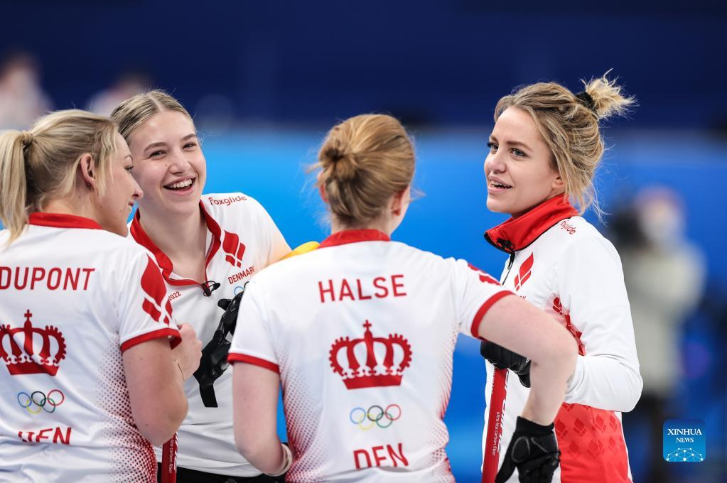 Mathilde Halse (2nd R) of Denmark talks with teamates during curling women's robin session 4 of Beijing 2022 Winter Olympics between Japan and Denmark at National Aquatics Centre in Beijing, capital of China, Feb. 12, 2022. (Xinhua/Yang Lei)