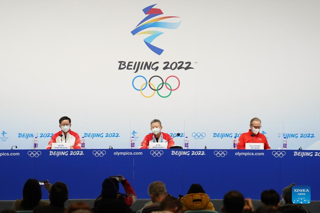 Zhao Weidong (L), spokesperson of the Beijing Organizing Committee for the 2022 Olympic and Paralympic Winter Games (BOCOG), Shen Qianfan, director-general of Village Planning and Operation Department of BOCOG, Mark Adams, spokesperson of the International Olympic Committee (IOC) attend a regular news conference of the BOCOG and IOC in Beijing, capital of China, Feb. 12, 2022. (Xinhua/Ju Huanzong)