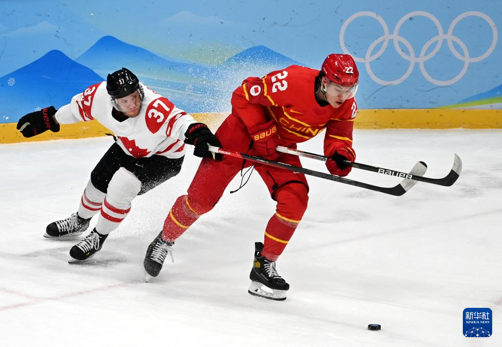 Ru Jiang (R) of China competes during the ice hockey men's preliminary round Group A match between China and Canada at National Indoor Stadium in Beijing, capital of China, Feb. 13, 2022. (Xinhua/Li An)