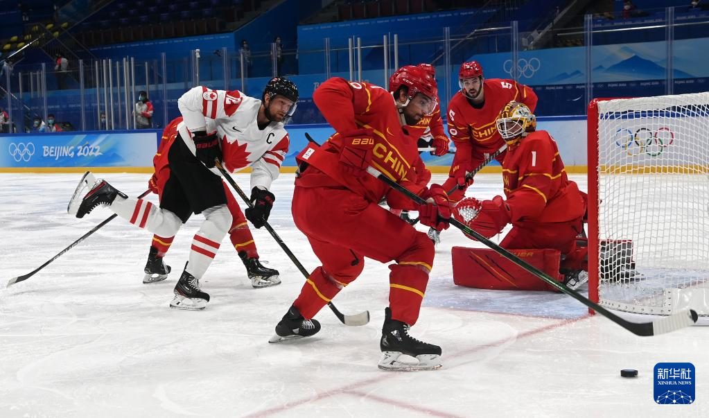 Athletes vie for the puck during the ice hockey men's preliminary round Group A match between China and Canada at National Indoor Stadium in Beijing, capital of China, Feb. 13, 2022. (Xinhua/Li Ziheng)